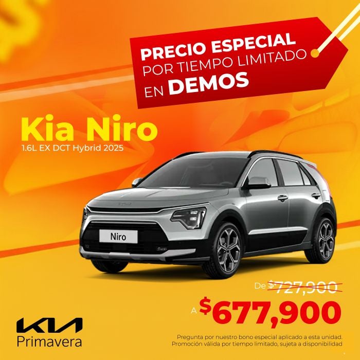 El precio mostrado ya incluye el bono aplicado. Válido únicamente para unidad Kia Niro 1.6L EX DCT Hybrid modelo 2025 en calidad demo.
