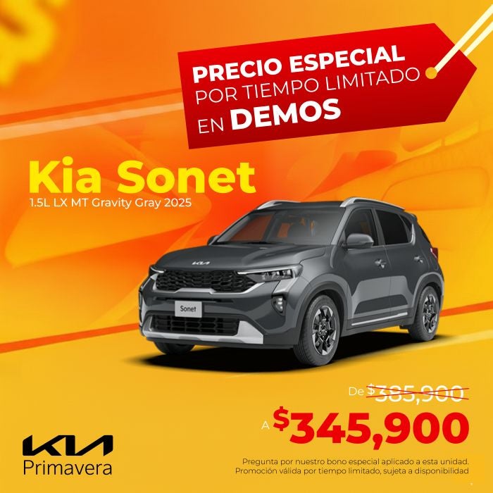 El precio mostrado ya incluye el bono aplicado. Válido únicamente para unidad Kia Sonet 1.5L LX MT modelo 2025 en calidad demo.