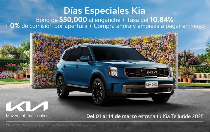Aprovecha los Días Especiales Kia para hacerte de la Kia Telluride 2025, la SUV insignia que combina lujo, espacio y potencia. Recibe un bono de $50,000 aplicado a tu enganche, una tasa preferente del 10.84% y 0% comisión por apertura. Además, compra ahora y empieza a pagar hasta mayo. Capacidad para 8 pasajeros, tecnología premium y un diseño imponente para quienes exigen lo mejor.