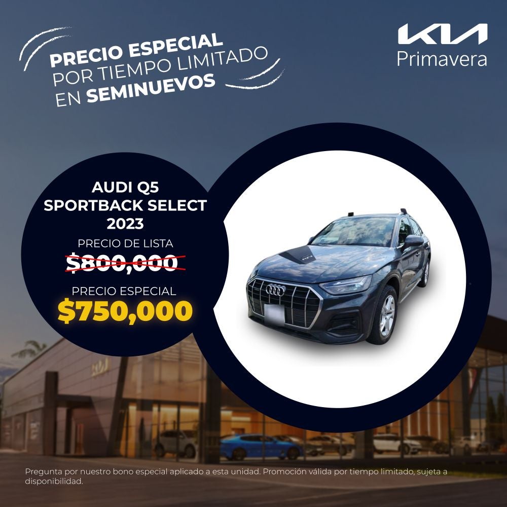 El precio mostrado ya incluye el bono aplicado. Válido únicamente para Audi Q5 Sportback Select modelo 2023 seminuevo.