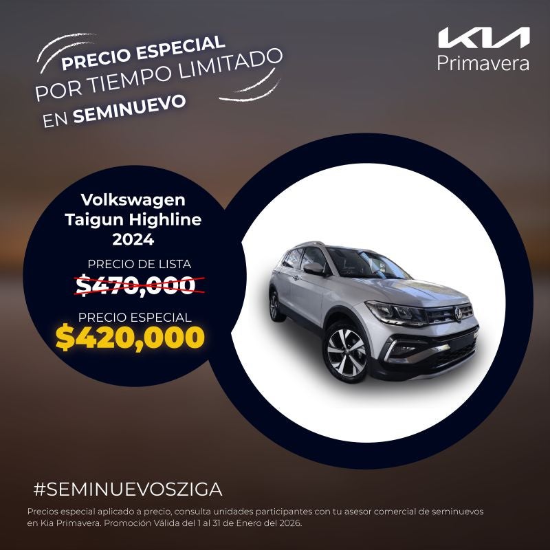 Aprovecha un Volkswagen Taigun Highline 2024 seminuevo con un precio especial por tiempo limitado. Una SUV con diseño moderno, gran equipamiento y excelente manejo, ahora con bono ya aplicado para que reestrenes con mayor valor en Kia Primavera.